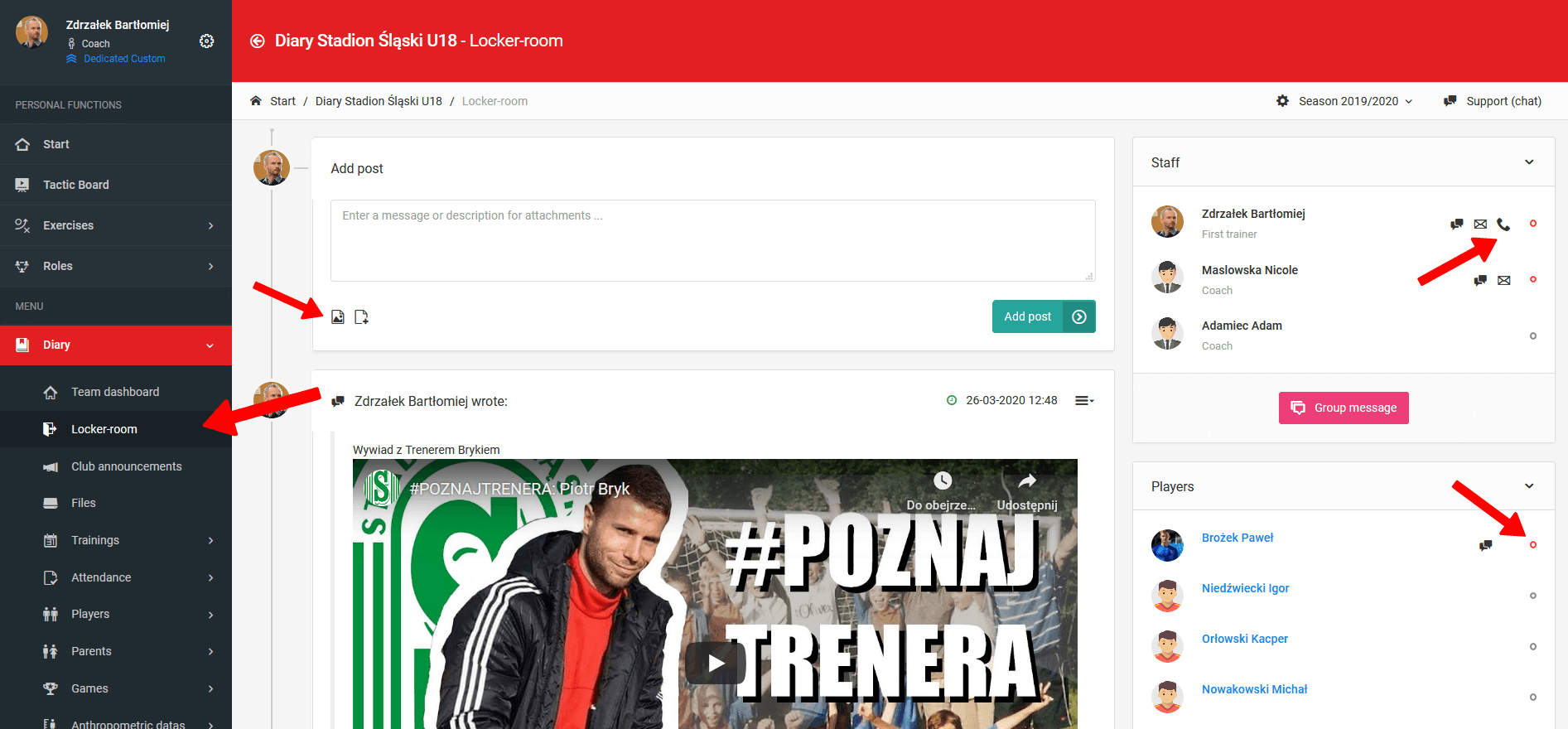 Раздевалка и клубная доска выступают в качестве закрытой группы пользователей, где вы можете обмениваться файлами, видео, фотографиями или ссылками. Кроме того, отсюда можно инициировать групповой разговор с выбранными пользователями, а также личный разговор с одним назначенным тренером. Раздевалка и клубная доска также доступны через мобильное приложение, и каждое сообщение, которое вы добавляете, генерирует push-уведомление.